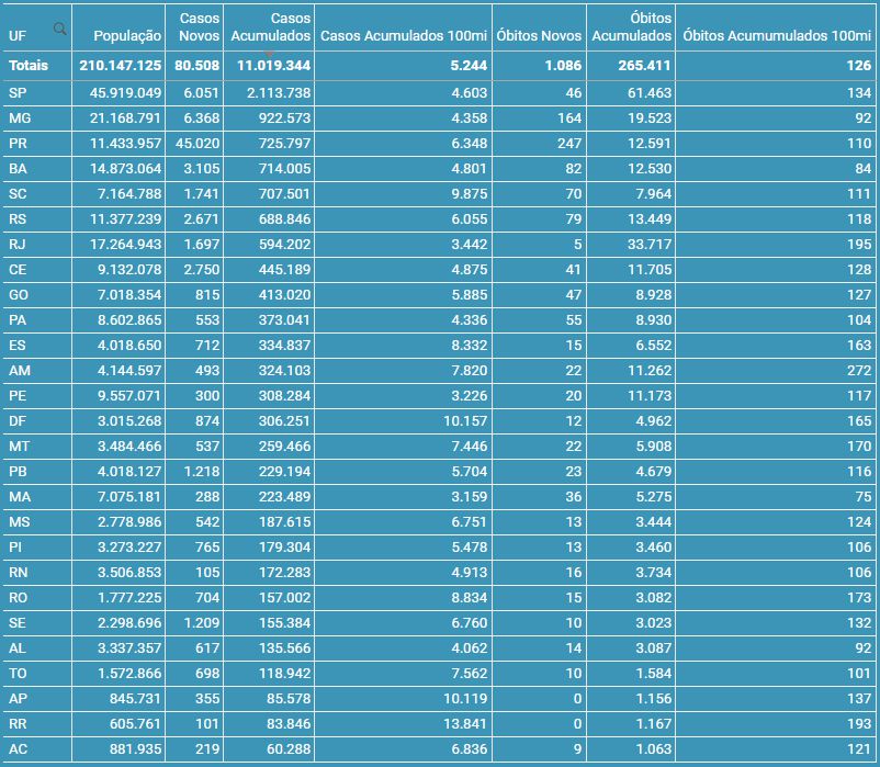 de casos e mortes por Estado: (Por ordem de Total de Casos