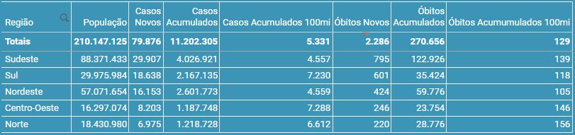 de casos e mortes por Região: (Por ordem de Novos Óbitos)