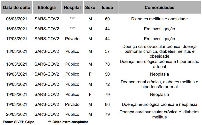 As mortes registradas ocorreram entre os dias 06 e 20 de março de