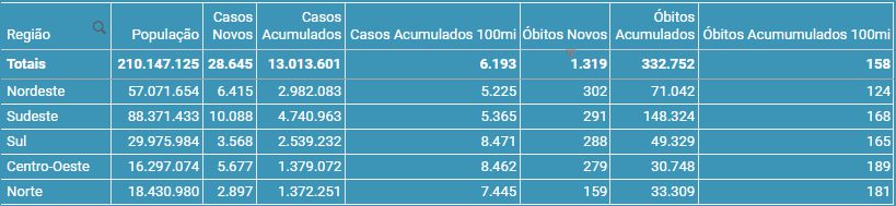de casos e mortes por Região: (Por ordem de Novos Óbitos)