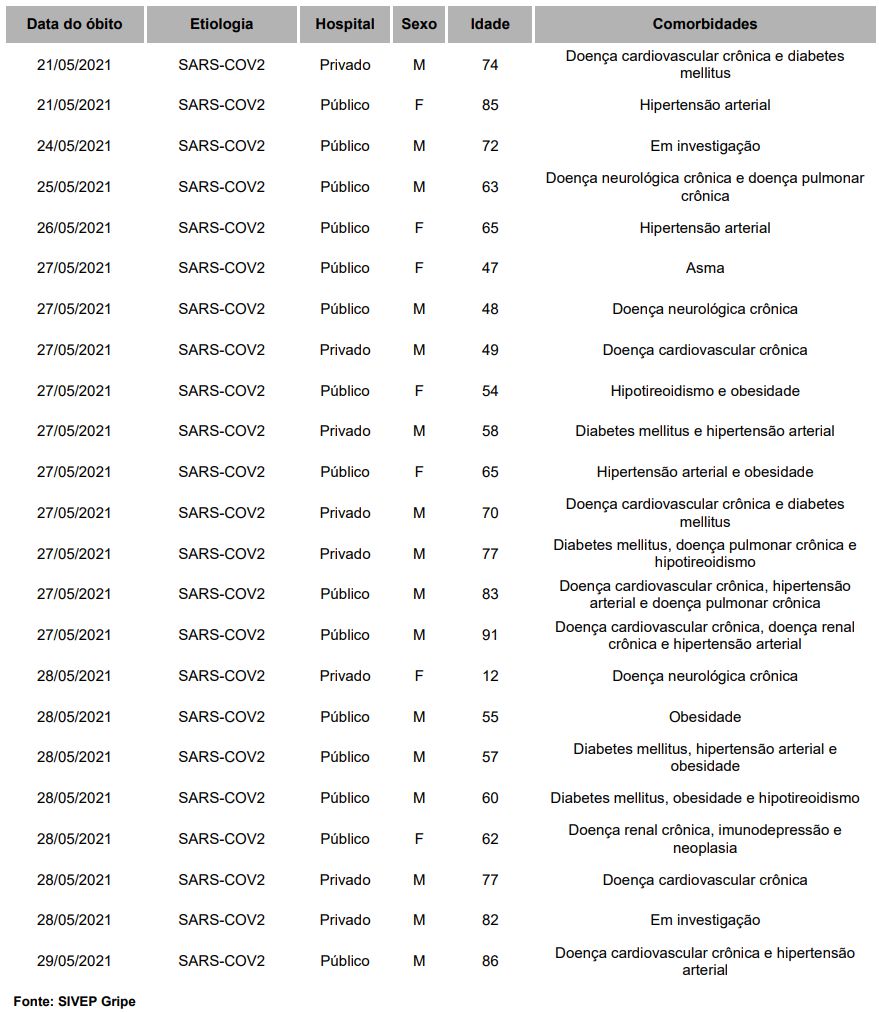 mortes registradas neste boletim ocorreram entre os dias 21 e 29 de