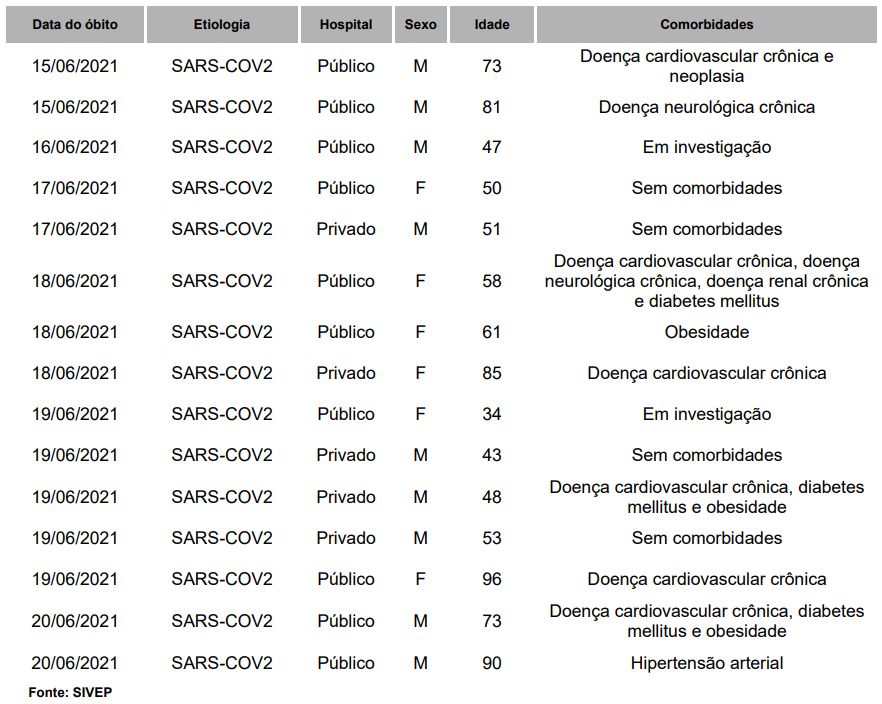 mortes registradas neste boletim ocorreram entre os dias 15 e 20 de