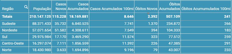de casos e mortes por Região: (Por ordem de Novos Óbitos)