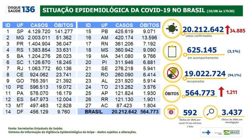 Balanço do Ministério da Saúde aponta que nas últimas 24 horas,