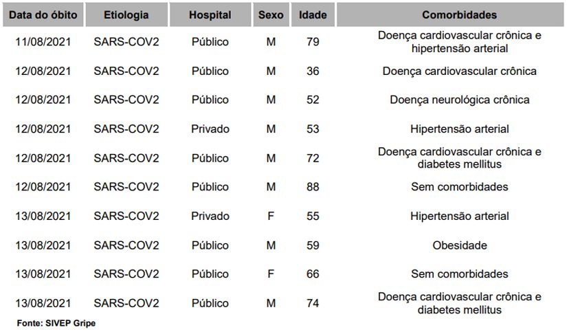 10 novos óbitos com covid-19. Apresenta também que a cidade