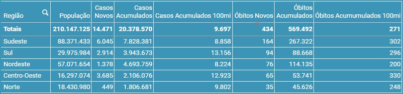 de casos e mortes por Região: (Por ordem de Novos Óbitos)