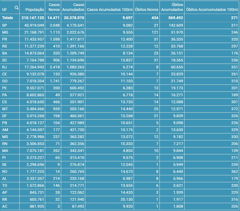 de casos e mortes por Estado: (Por ordem de Total de Casos