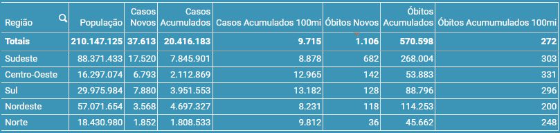 de casos e mortes por Região: (Por ordem de Novos Óbitos)