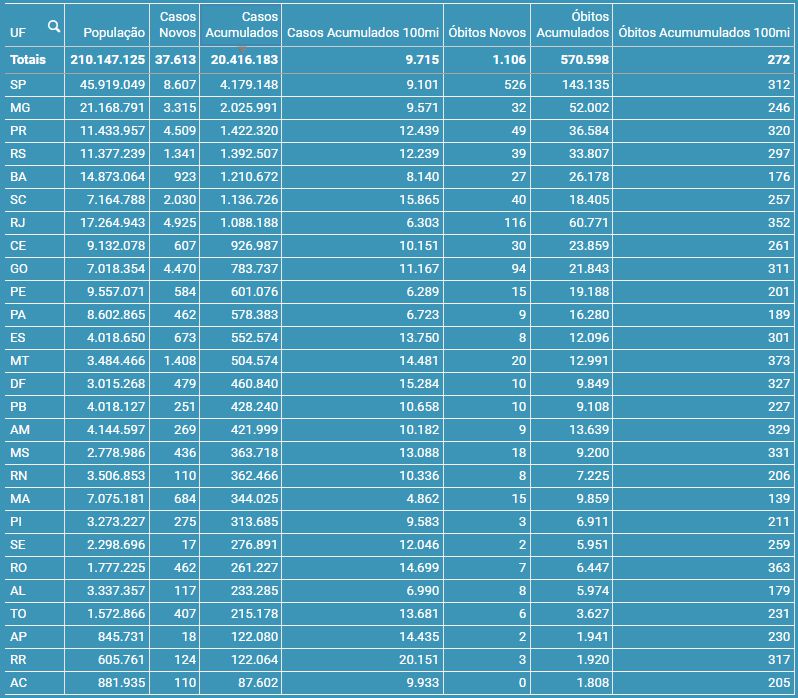 de casos e mortes por Estado: (Por ordem de Total de Casos