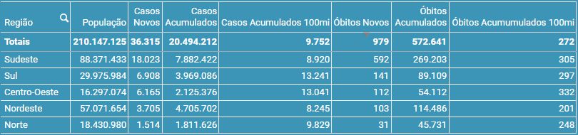 de casos e mortes por Região: (Por ordem de Novos Óbitos)