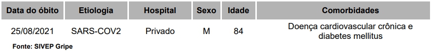 morte registrada neste boletim ocorreu no dia 25 de agosto de 2021,