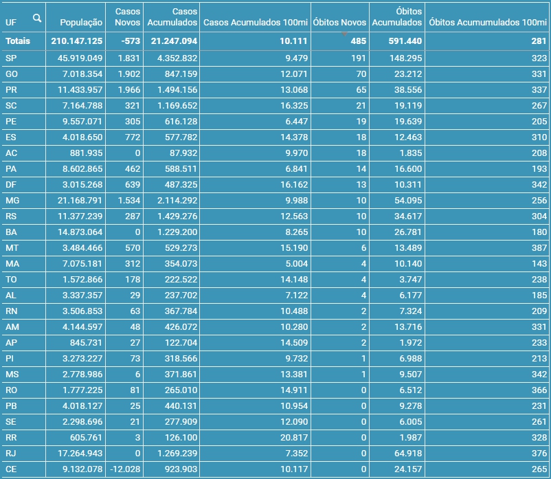 (21) 485 mortes e -573 novos casos diagnosticados de covid-19,