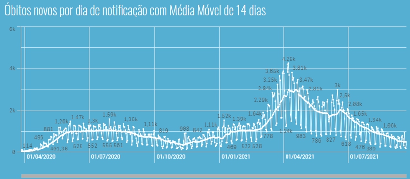 flutuações, a média móvel de óbitos nos últimos 7 dias é de