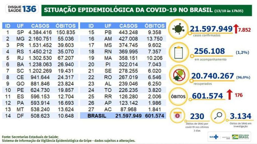 chegou a 601.574. Em 24 horas, as autoridades de saúde registraram