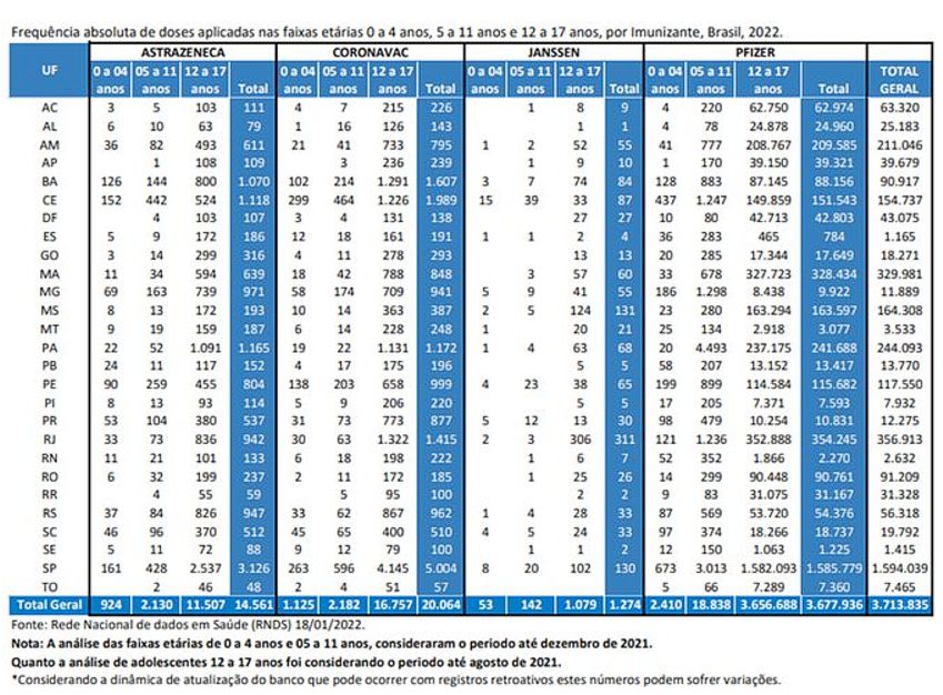 tabela também aponta a aplicação da vacina da Pfizer, mas em sua